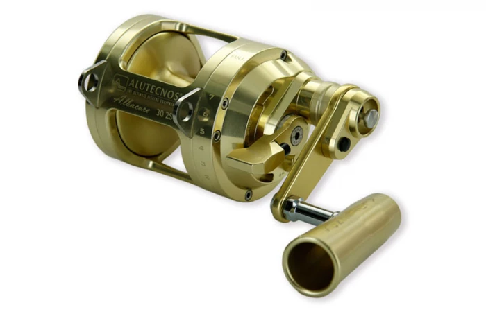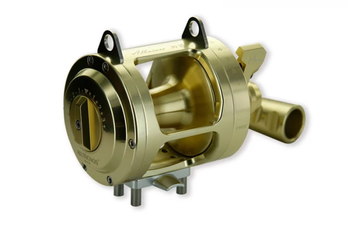 “Infinite anti reverse” system, right flange and two-button gear change. The “two speed” model is equipped with five protected stainless steel ball bearings, a tempered stainless steel gear wheel and gears and a drag washer made from the latest carbon composite. These characteristics ensure long hours of fighting while maintaining sound braking characteristics, smooth reeling and eliminating the occurrence of stick-slip. All the aluminium parts have been carefully polished, ultrasonically cleaned, buffed and provided with anodizing.