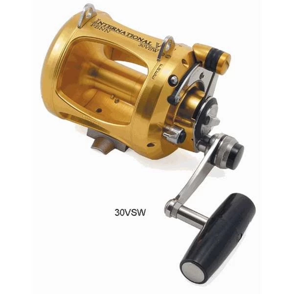 The International V reels offer the most advanced and reliable fish-fighting performance in the world, with an ergonomically designed, contoured, one-piece machined frame, and unbelievable cranking power and strength. Distinctive pure gold color separates Penn from the impostors.