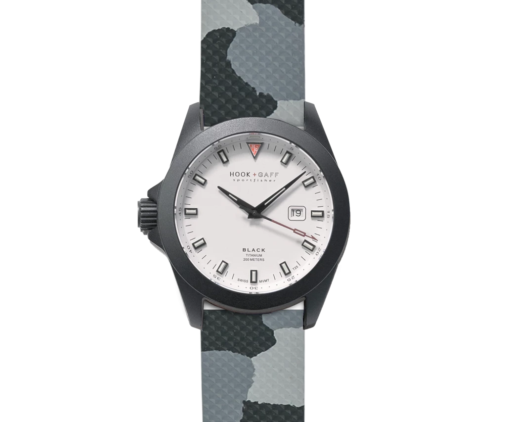 The Sportfisher Black was designed to be the ultimate watch for the hardcore angler who is out on the water during all hours of the day and night. The Sportfisher Black is Hook+Gaff’s first model to utilize 24-hour illumination tritium technology that continuously illuminates the dial’s hour markers and hands. Hook+Gaff’s specialty illumination will always shine bright to lead the way on offshore pursuits. This performance-driven timepiece is not only a necessity on the water, but is handsomely crafted with a black-on-black design for show- stopping luxury.