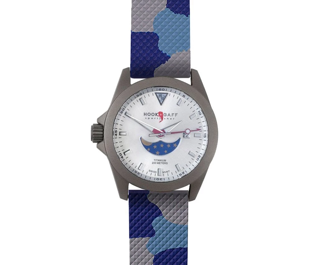 The new Sportfisher II Moonphase Dial silver watch houses a custom Swiss quartz movement with moon phase and date. The crown is uniquely placed on the left side of the watch face to avoid irritation during active angling situations. The titanium case is corrosion-and-water-resistant, in addition to being a poor conductor of heat for those hot days on the water. Specifications include: