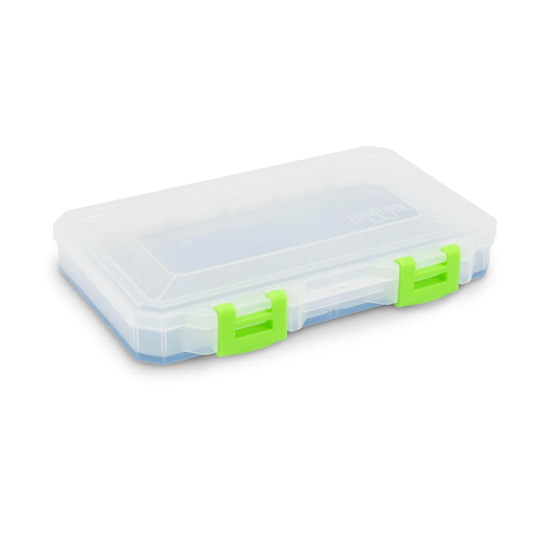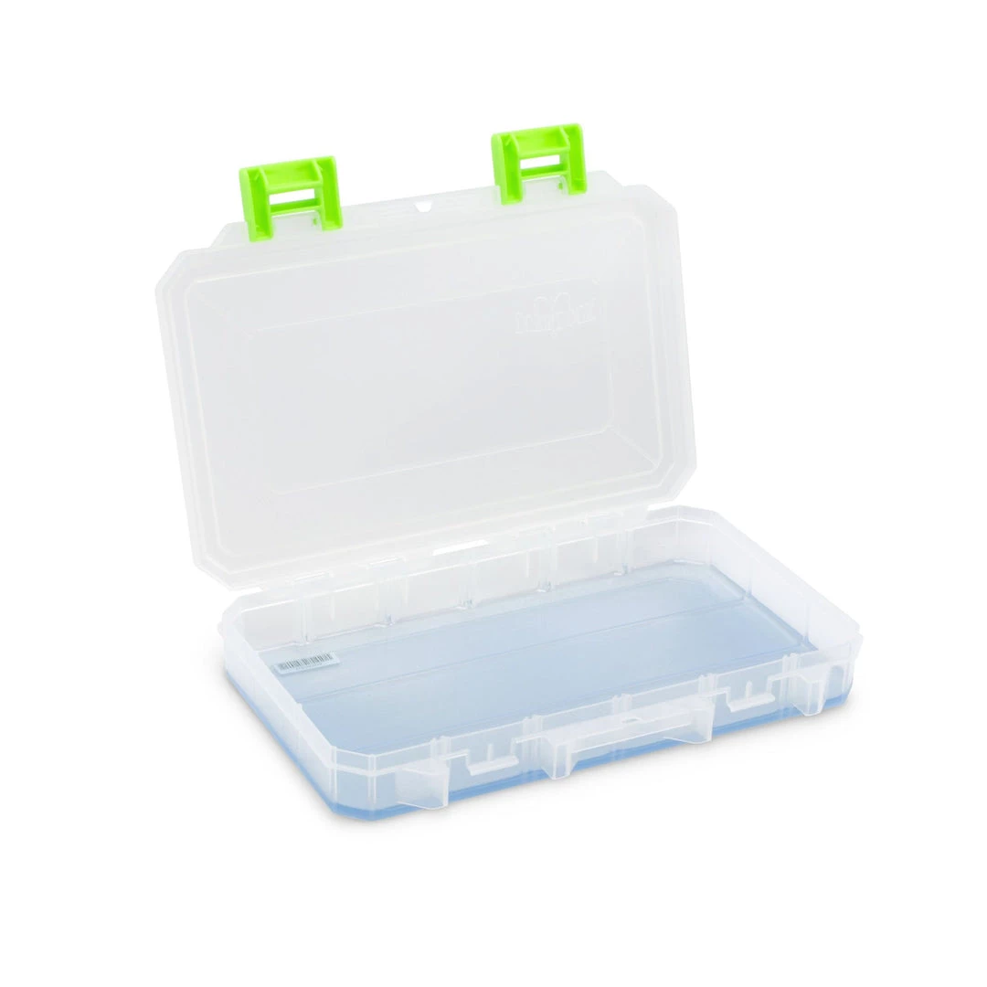 Our medium box with ElasTak Liner has optional permanent dividers, creating one, two or three long compartments. The tackle box features clear plastic, sturdy yet easy-to-open green latches, and comes with Snap-Apart Dividers so you can customize your tackle box. The ElasTak Liner is scent-free and will protect your lures, baits, weights, hooks and terminal tackle.