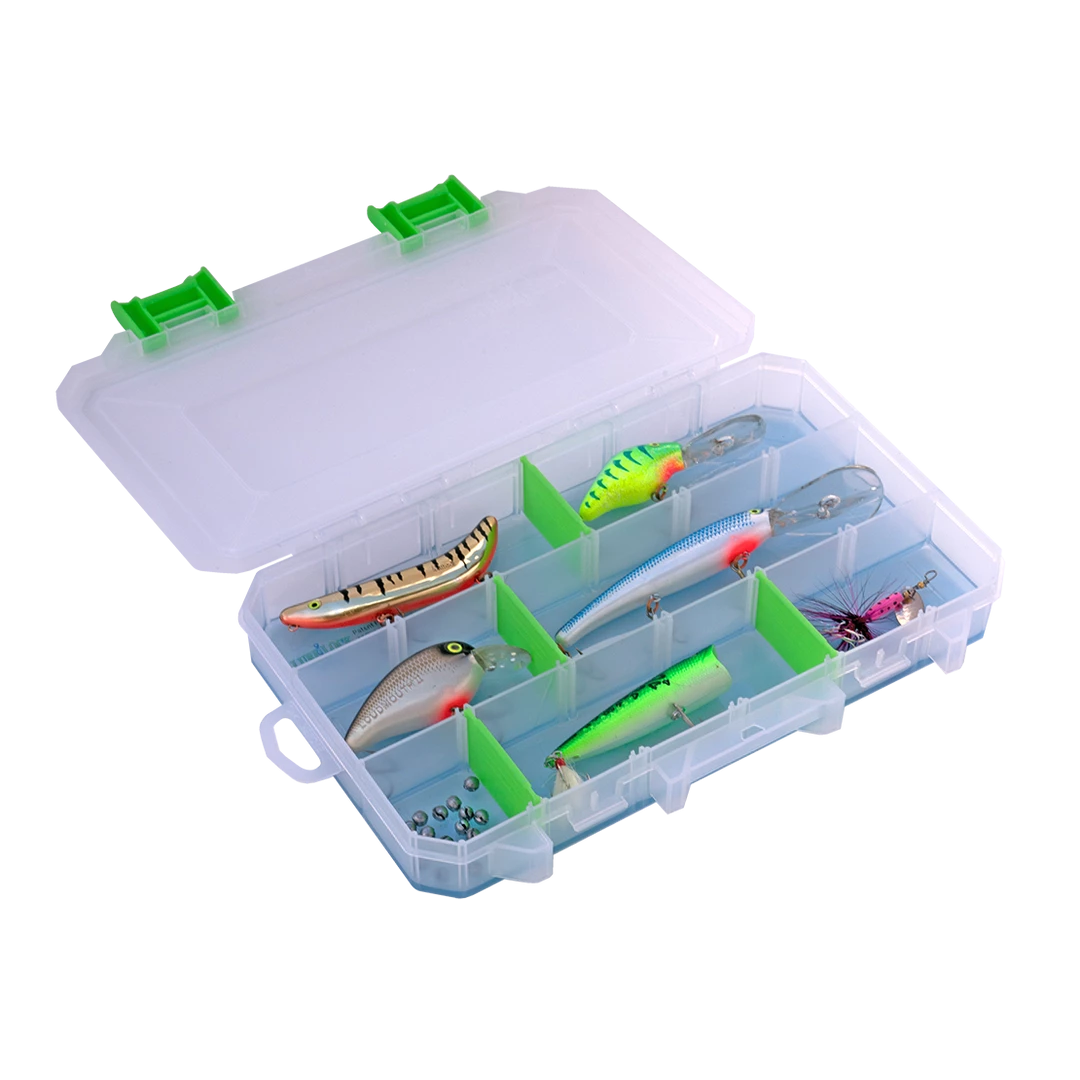Need a small box to protect small baits, lures and hooks? Our small box is just the answer. It comes with ElasTak Liner and optional permanent dividers, creating one, two or three compartments. The tackle box features clear plastic, sturdy yet easy-to-open green latches, and comes with Snap-Apart Dividers so you can customize your tackle box. The ElasTak Liner is scent-free and won’t stick to your lures.
