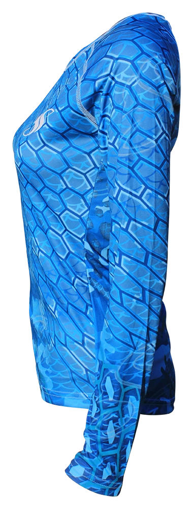The new ladies blue cycloid pattern is an elaborate mix of wild scale and camo patterns that truly stand out while keeping you protected on the water. The performance longelseeve is made with PURE-tech™ moisture wicking technology and a UPF +50 Solar Protection rating. Perfect for fishing, the beach or working out.