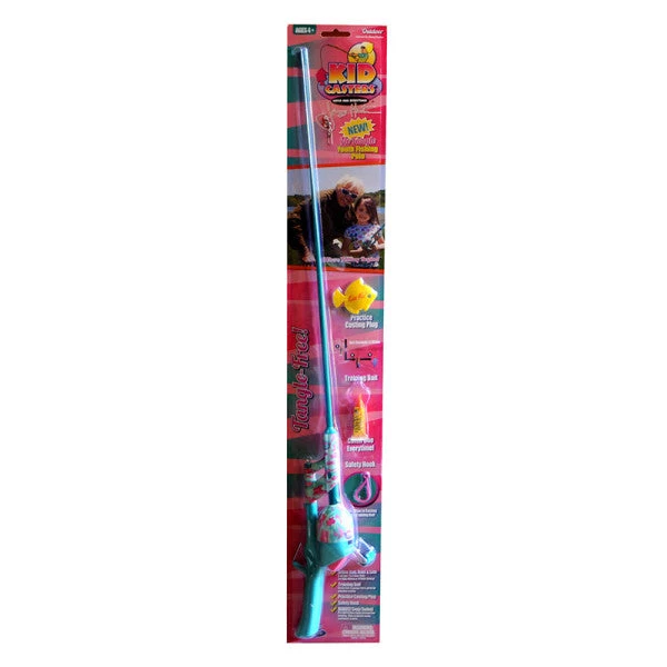 The No Tangle rod is 34”, with a 3.1:1 gear ratio reel and pre-spooled 6 lb test line. We included 1 sponge fish training lure that instantly transform into large colorful sponge fish after being cast into the water. Sponge fish can be recast over and over again for fun practice. Also included is a practice casting plug and safe plastic hook. The hook ties on to any fishing line and then easily clips on to the casting plug or training lure. Start your kid off fishing the right way with the Jimmy Houston Kid Casters No Tangle Fishing Rod.